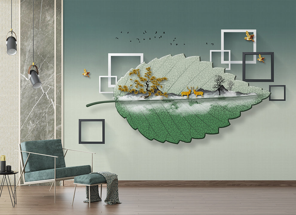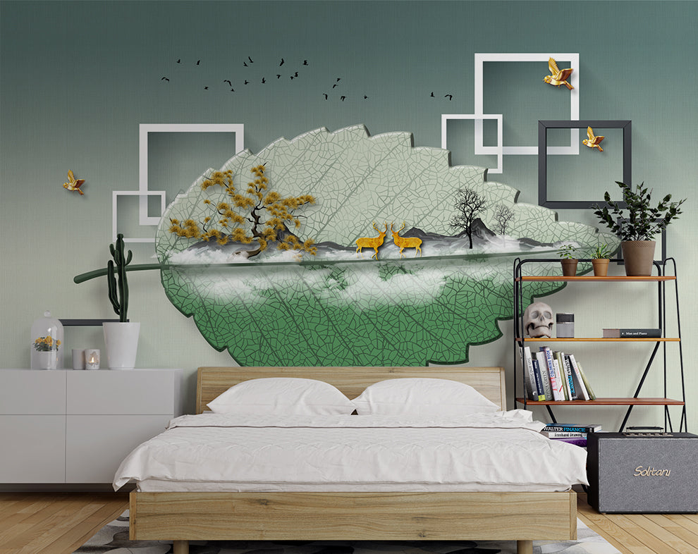 3D Beautiful Leaf Deer Trees Birds Frames Wallpaper