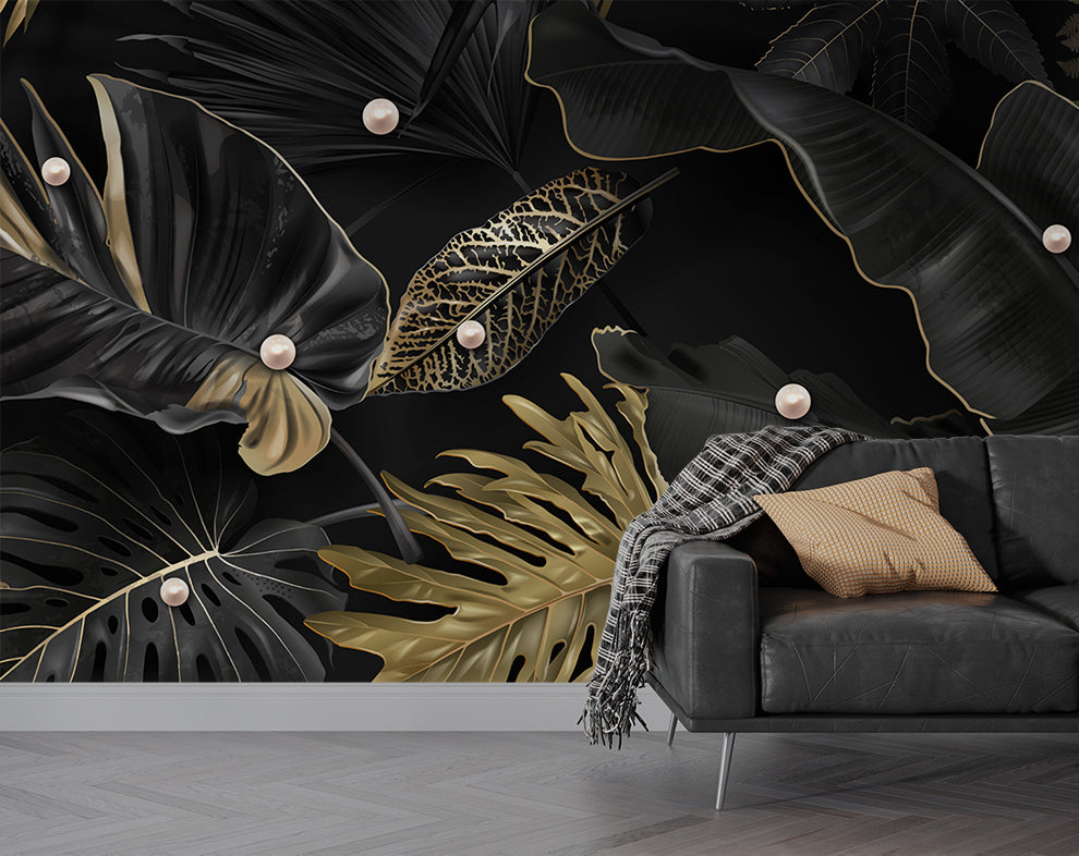 3D Black And Gold Leaf Pearl Embossed Wallpaper