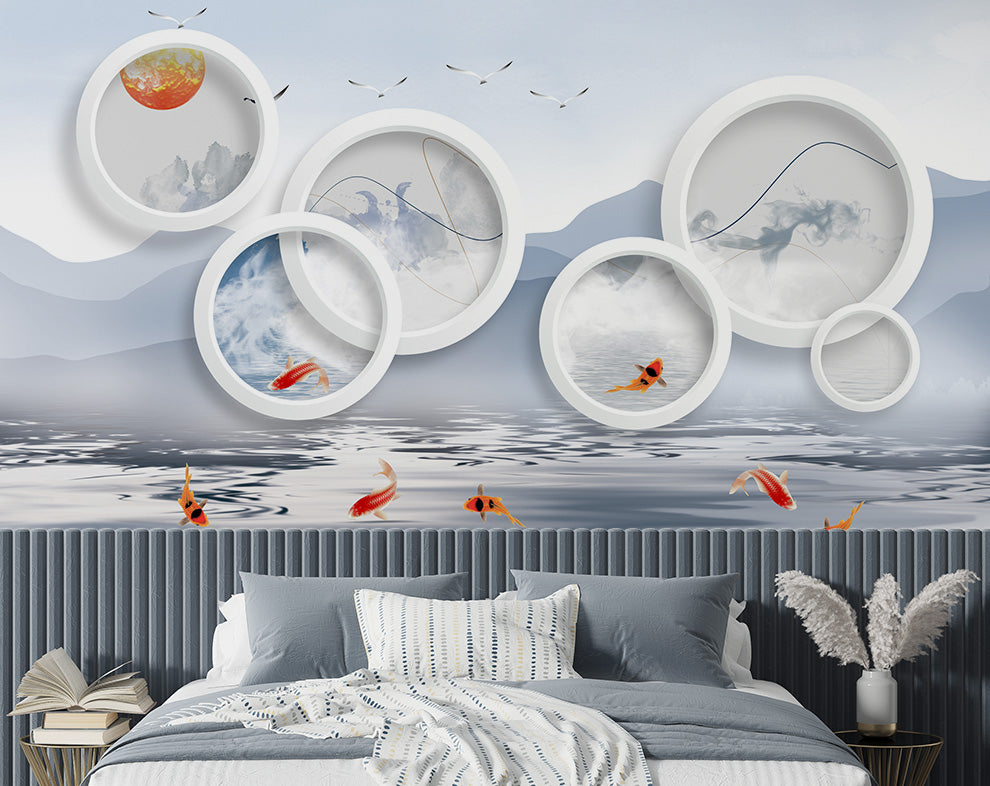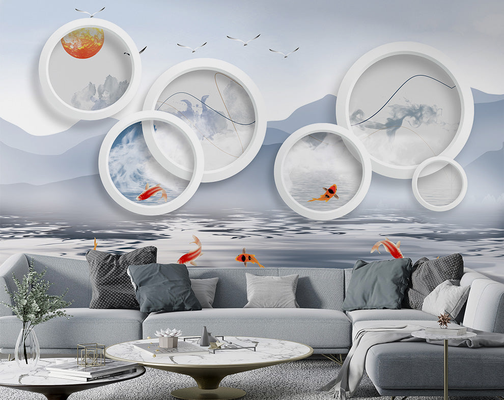 3D Circle Art And Fish Wallpaper | Living Room Wallpaper