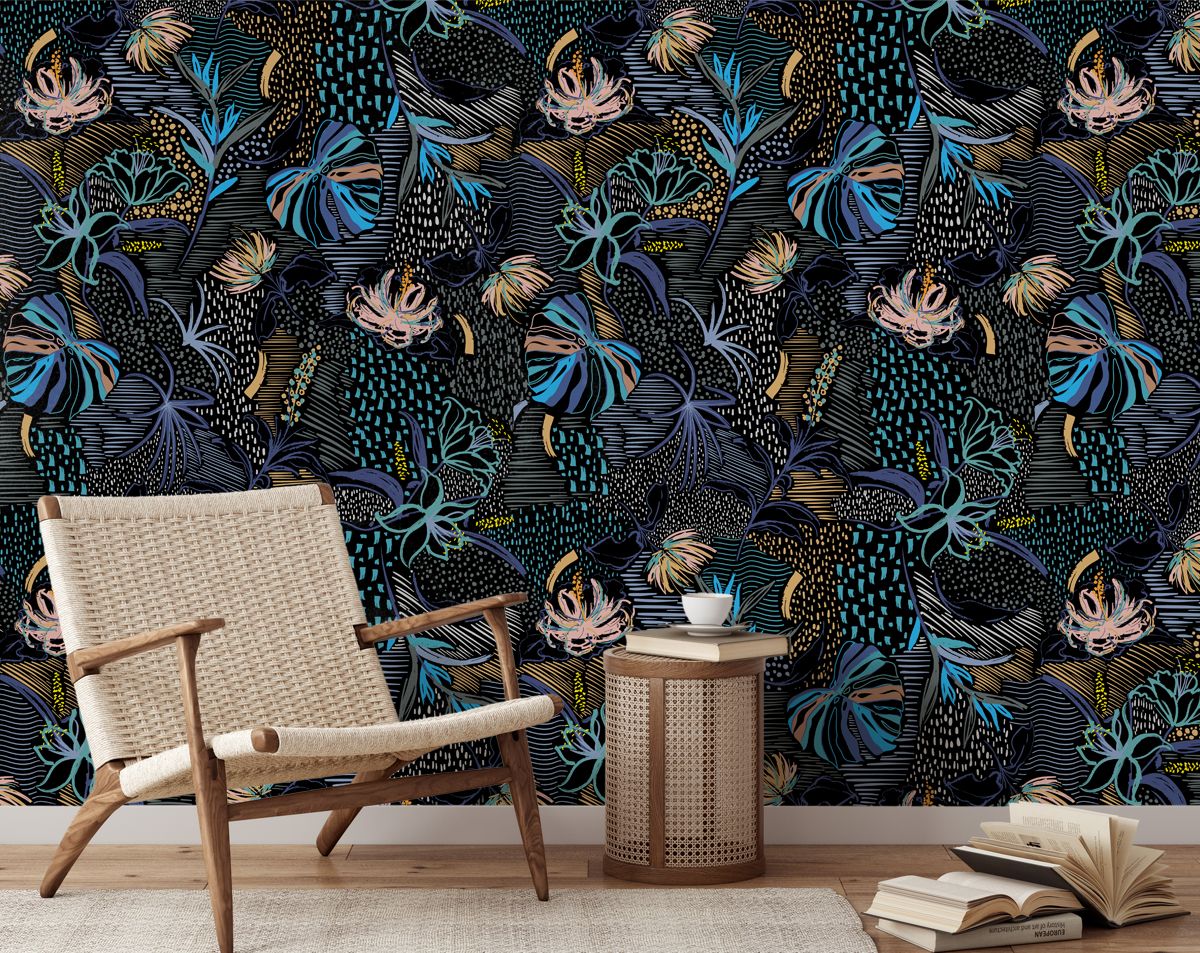 Abstract Botanical Tropical Palm Forest Wall Design Hand Drawn Flower Wallpaper