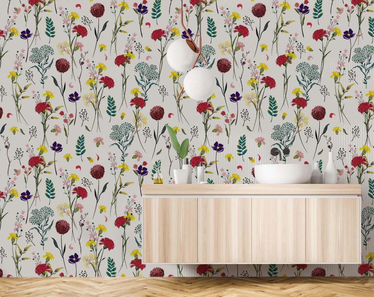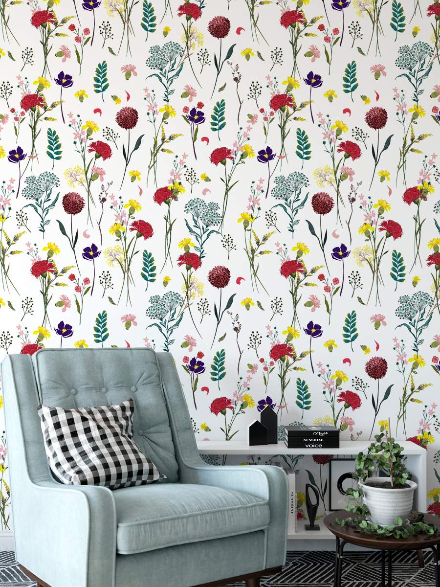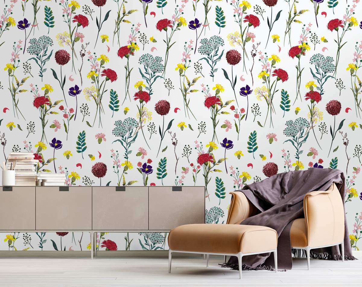 Blooming Colourfull Flowers Hand Drawing Wallpaper Rolls