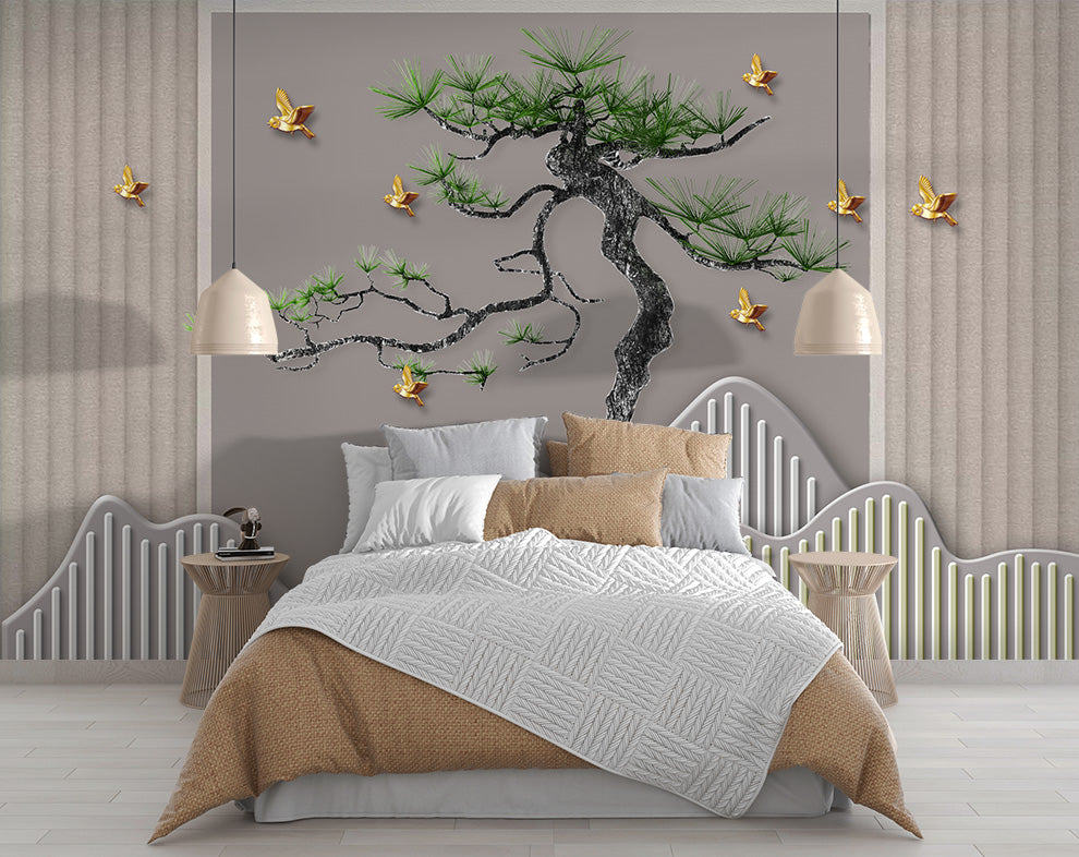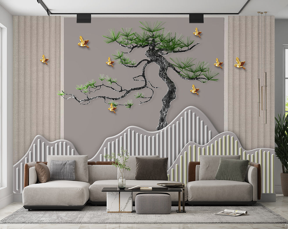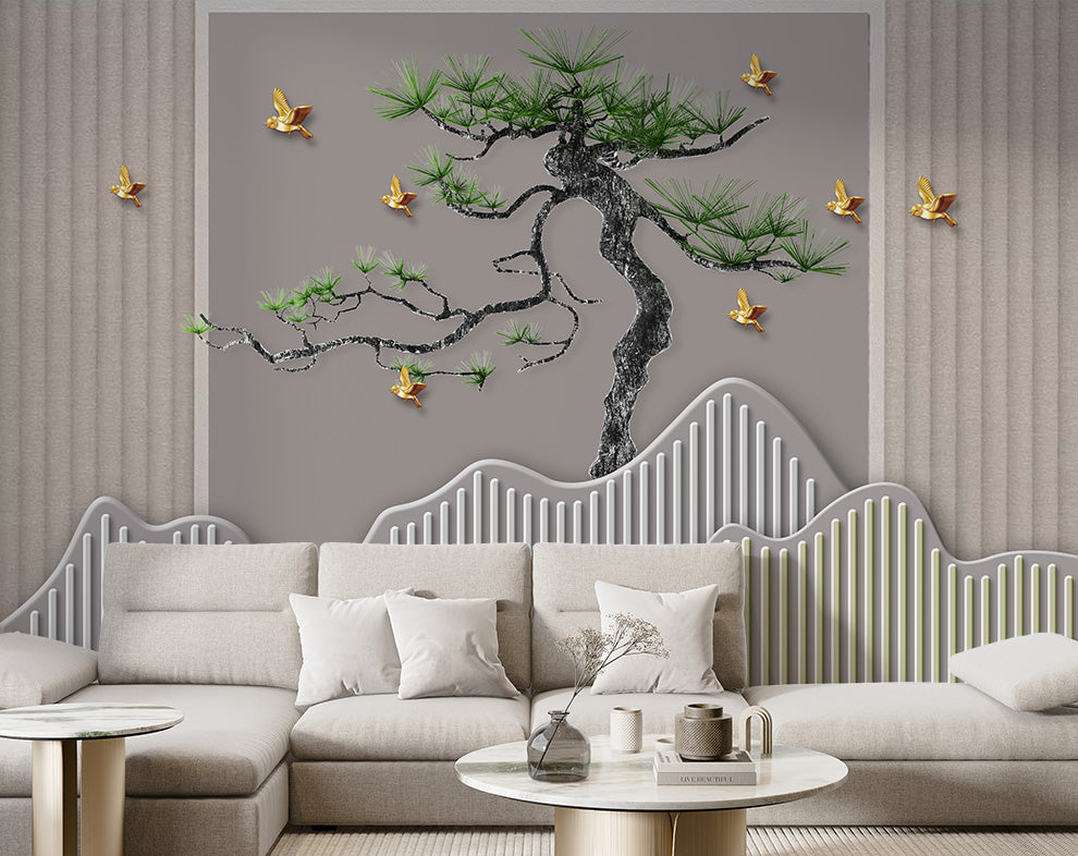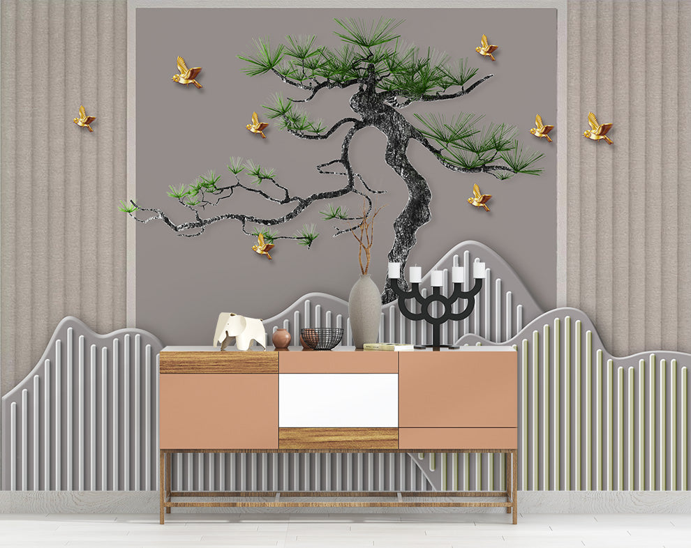 Curved Pine Tree And Golden Birds Mural Wallpaper