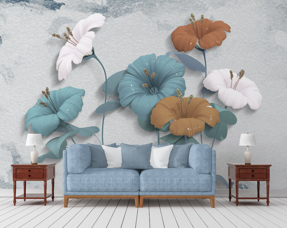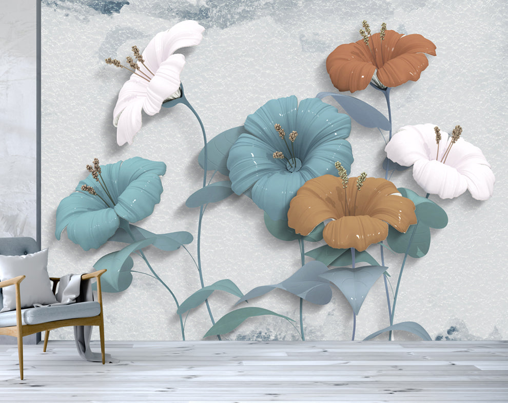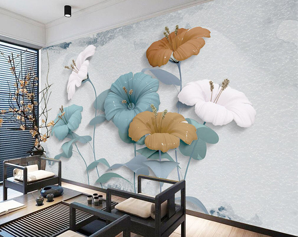 Custom 3D Wallpaper Blue, White and Light Orange Flower Wallpaper for Walls