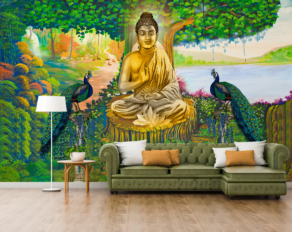 Gautam Buddha and Peacock 3D Mural Wallpaper