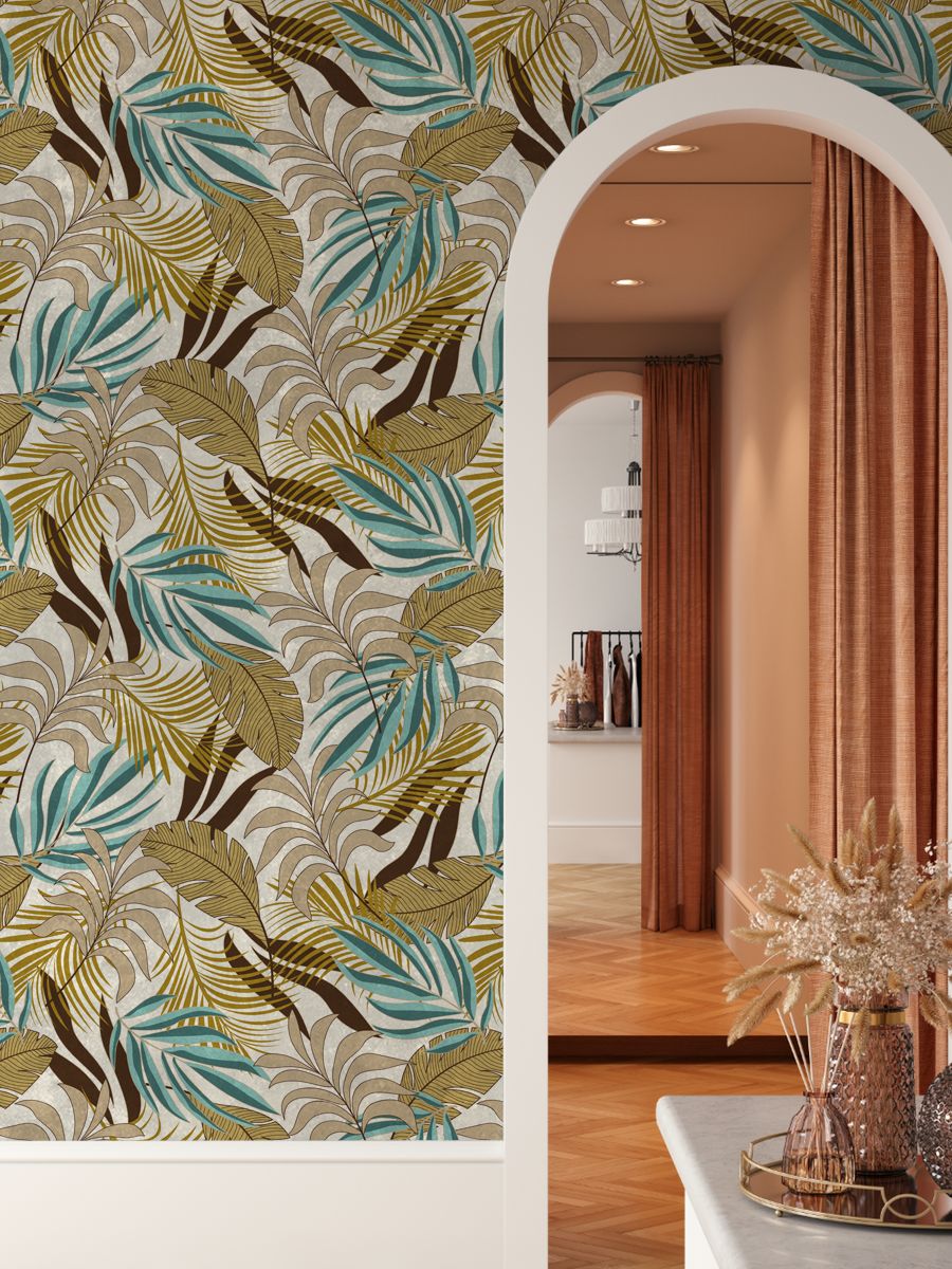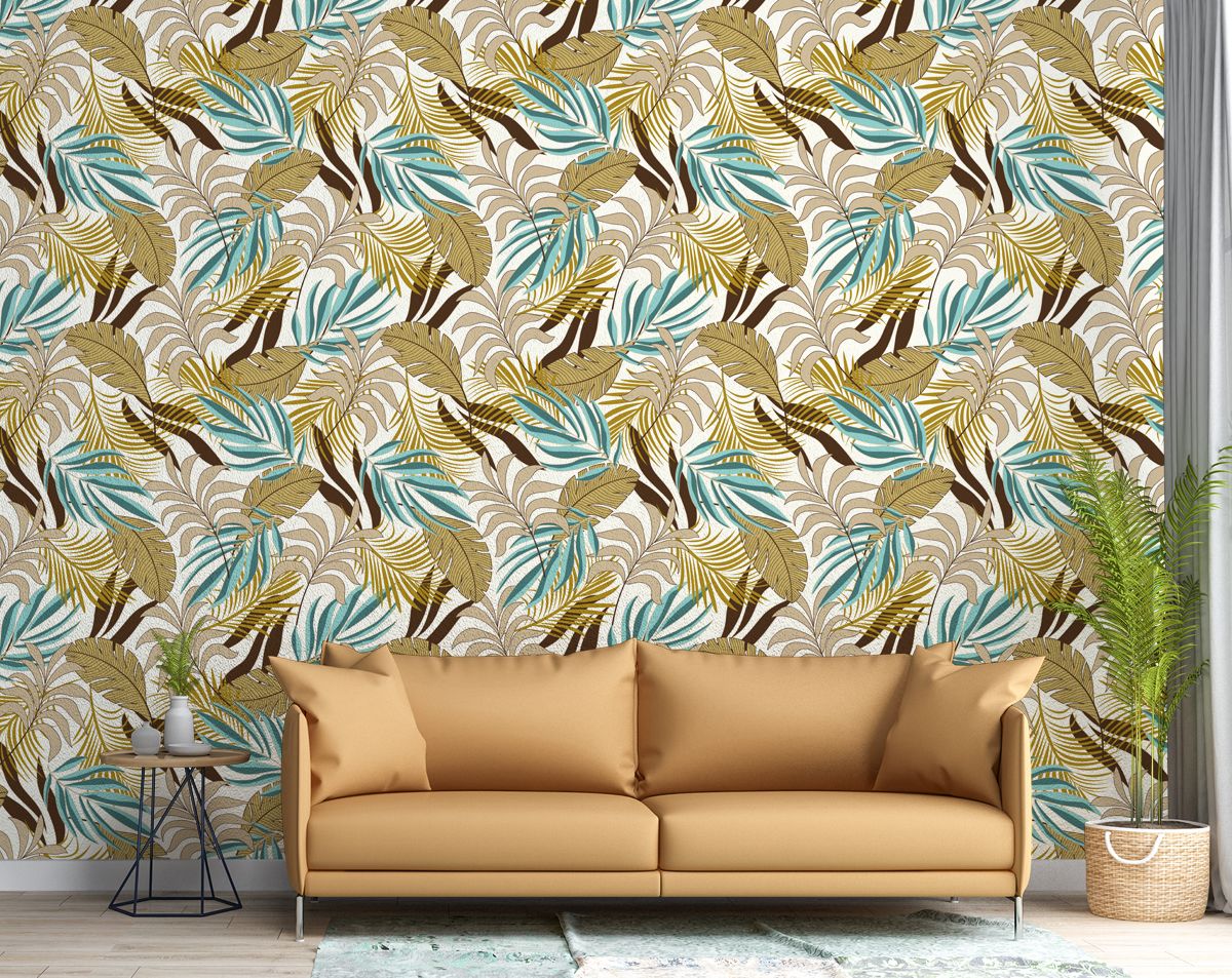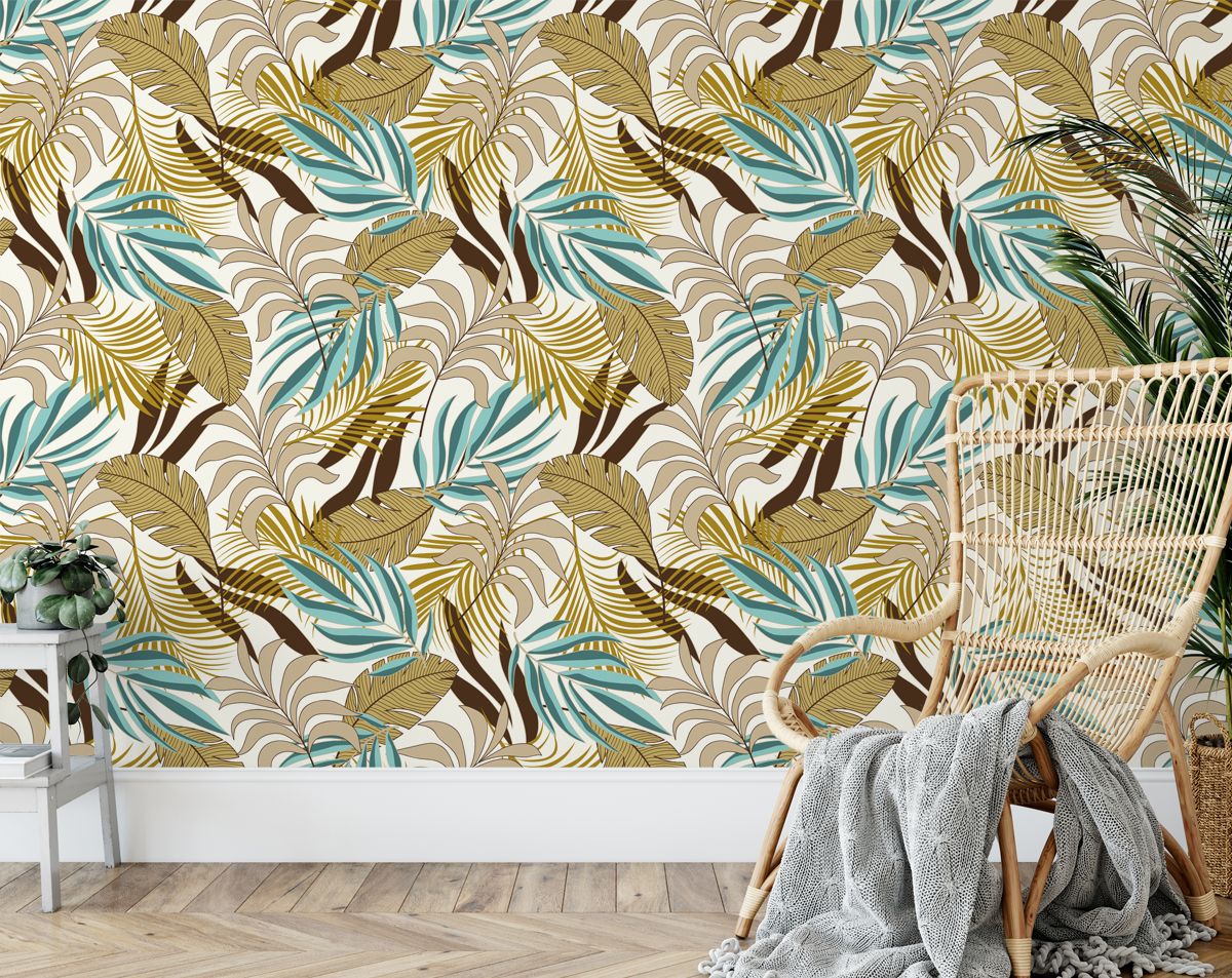 Light Yellow Wallpaper With Exotic Green Leaves, Tropical Wallpaper