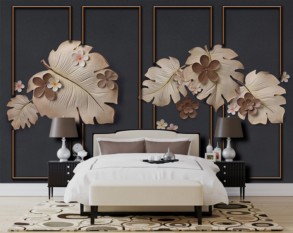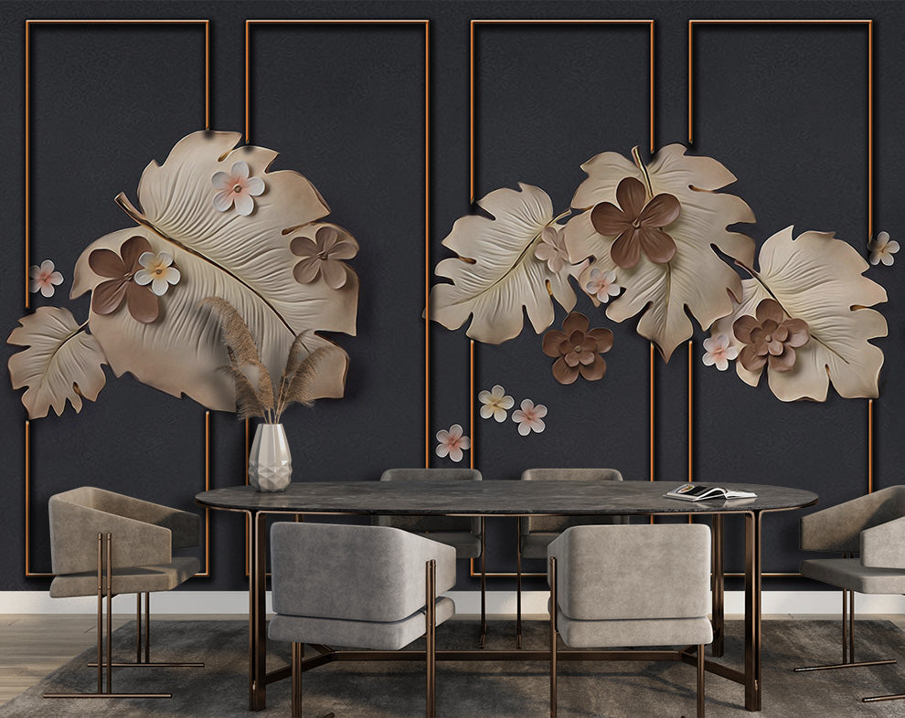 Modern 3D Flowers & Leaf Embossed Background Wallpaper