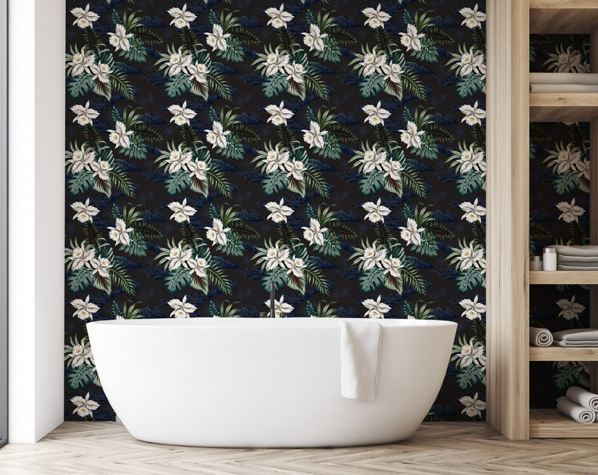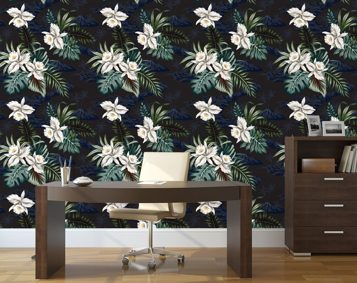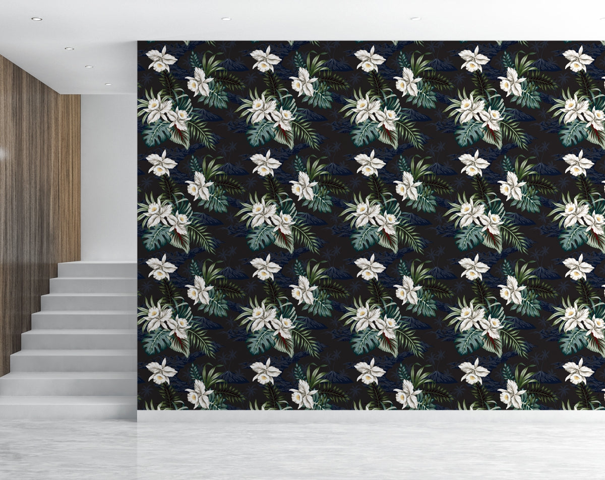 White Orchid Flower and Palm Leaves Floral Wallpaper